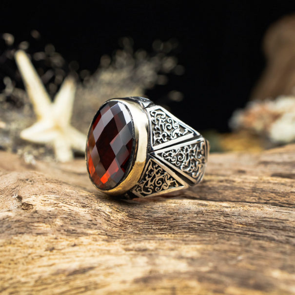 925 ayar gümüş Tasarım Sarmaşık model kırmızı Garnet Taşlı trend Erkek Yüzük