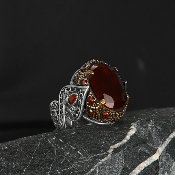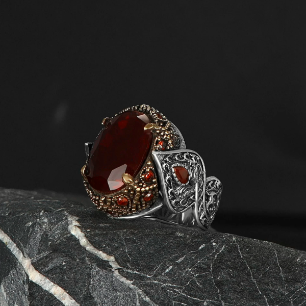 Kırmızı Zirkon Taşlı 925 Ayar Erkek Gümüş Yüzük