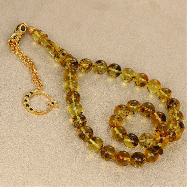 The Fossilized Amber Prayer Beads with Gold-Plated Silver Tassels stand out with their handcrafted, fossil-textured amber beads and elegant gold-plated silver tassel. This collectible prayer bead will appeal to both those seeking spiritual peace and those who value aesthetic appeal.